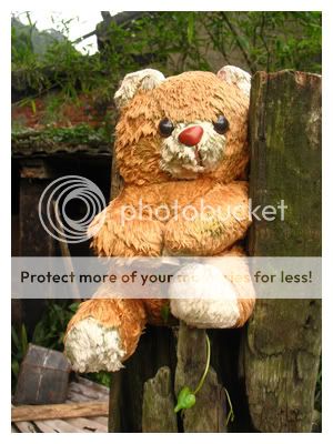 這隻熊娃娃就這樣鑲在木柱上=口=